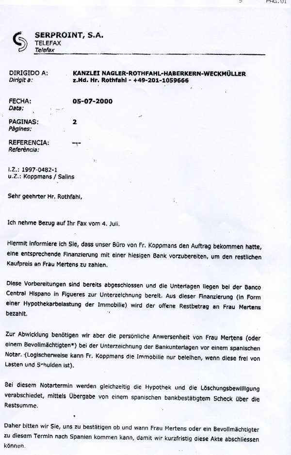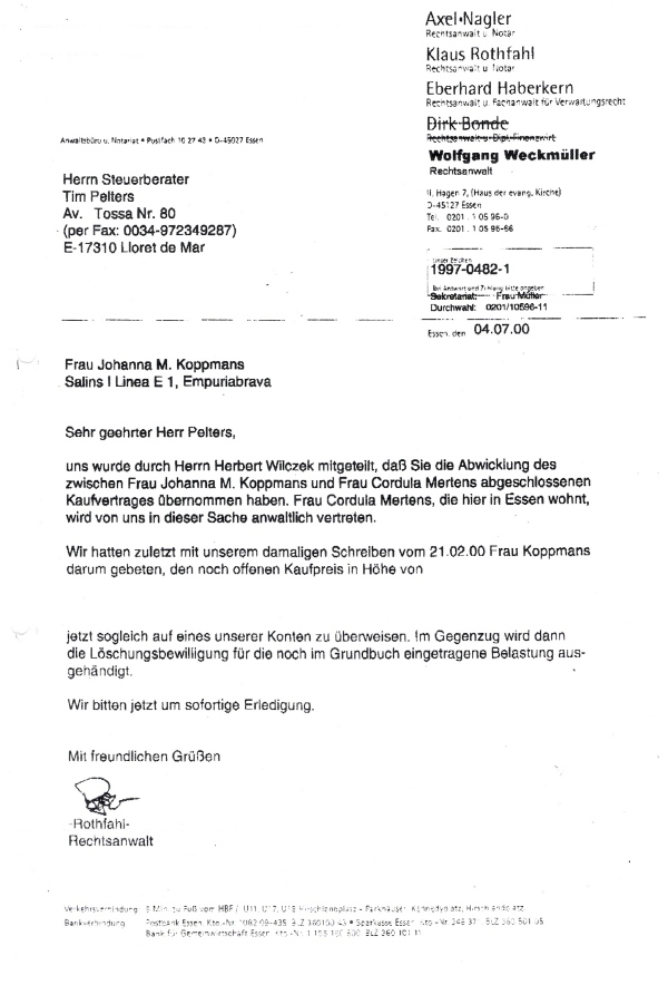 Breve traducción: Sra. Johanna M. Koppmans, Salins1 Línea E1, Empuriabrava Estimado Sr. Pelters, El Sr. Herbert Wilczek nos ha comunicado que Usted se hace cargo de los trámites del contrato de compraventa entre Sra. Johanna M. Koppmans y la Sra. Cordula Mertens, a partir de ahora. Representemos a la Sra. Cordula Mertens, con domicilio aquí en Essen, como avocados en este caso. Como ultimo, con nuestro escrito del 21-02-2000, hemos pedido a la Sra. Koppman de transferir la cantidad restante de la compraventa en cantidad de…….. a una de nuestras cuentas. En contrapartida le entregaríamos nuestro consenso para quitar la carga del registro (escritura) Rogamos su trámite inmediato, Un saludo Avocado