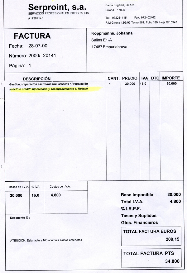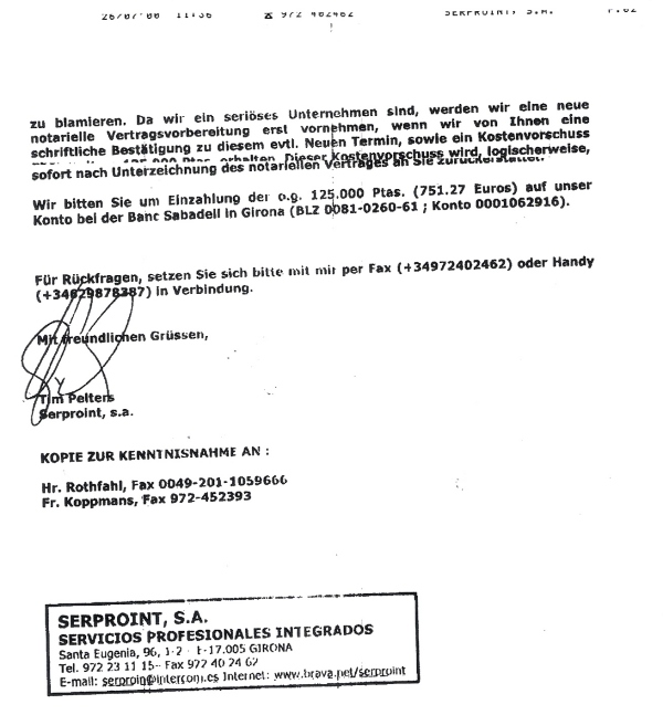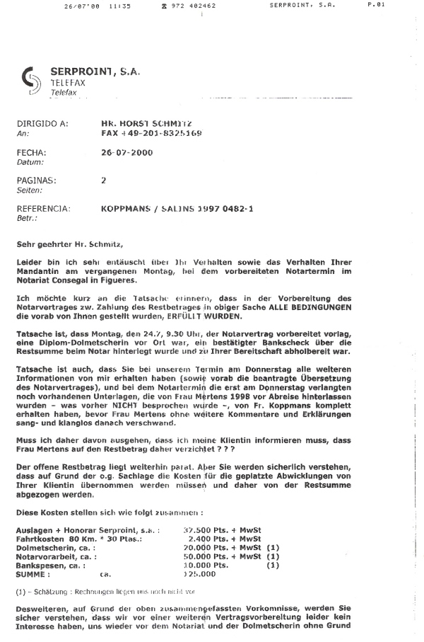 Breve traducción: Estimado Sr. Schmitz, Desafortunadamente estoy muy decepcionado por su comportamiento, y el de su mandante en el término de la reunión preparatoria en la Notaria Concejal de Figueras el lunes pasado. Me gustaría recordarle que previo a la preparación del contrato notarial hemos cumplido con todas sus exigencias, como el pago de la cantidad restante entre otras. Es un hecho que en fecha de 24-07- a las 09.30 h el contrato notarial estaba preparado, un intérprete jurado estaba presente, y un pagaré bancario confirmado por la suma restante ha sido entregado en notaria y a su disposición. Debo de presumir que tengo que avisar a mi cliente que la Sra. Mertens renuncia a la cantidad restante??? La cantidad restante sigue aquí, pero Usted seguramente entenderá que según los hechos tenemos poner en cuenta los gastos por los tramites interminados aquel día, a su cliente, y por esto se restarán de la suma restante. Los gastos se componen de los puntos siguientes: Gastos y honorarioSerpoint s.a. Gastos de transporte Interprete jurado Trabajo preparativo notaría Gastos bancarios Total 12500 pts. Encima, por causa de los hechos aquí mencionados, seguramente podrá entender que no nos interesa seguir preparando contratos, y de comprometernos ante notaría sin razón. Al ser una empresa seria, solo iniciaremos una nueva preparación notarial si recibimos de Usted una confirmación por escrito tal como un adelanto de los gastos…. Le rogamos de transferir la cantidad de 12500 pts. (751,27€) Arriba mencionados a nuestra Cuenta en el Banco Sabadell en Girona (BLZ0081-0260-61; Konto 0001062916) Para cualquier pregunta contacten por fax a 0034972402462, o por móvil a 0034….) Un saludo Tim Pelters, Serpoint SA