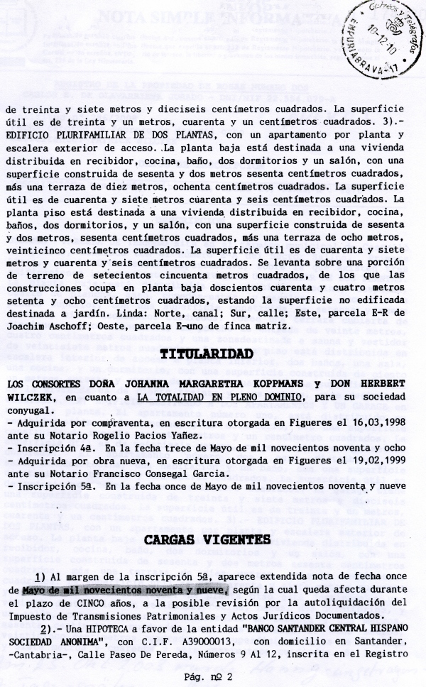 Breve traducción del documento. Estimado Sr. Rothfahl, Referente a su Fax recibido el 4 de julio. Mediante esta carta le informo que la Sra. Koopmans encargo a nuestra oficina de preparar una financiación para poder abonar el precio restante a la Sra. Mertens. Las preparaciones ya están finalizadas y la documentación esta presente en el banco Central Hispano de Figueres y listo para firmarlo. Esta financiación en forma de una hipoteca inscrita en la casa es para abonar el importe restante a favor de la Sra. Mertens. Para finalizar la compraventa y para firmar la documentación bancaria, es necesario que la Sra. Mertens este presente personalmente o un apoderado ante el notario español. Y lógicamente la Sra. Koopmans solo firma si la casa esta libre de cualquier carga. En esta cita notarial se inscribirá la hipoteca y el consentimiento de la cancelación y la entrega del cheque bancario de la cuantía restante. Por esto le pedimos de confirmarnos la presencia de la Sra. Mertens o de un apoderado en su nombre para acabar lo antes posible esta operación. _______________________________________
