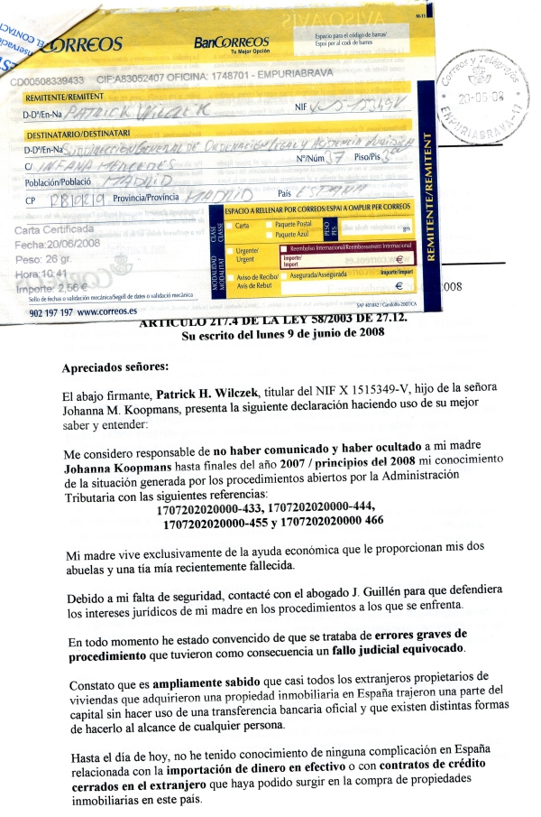 La Carta completa a continuacion.......... Att. Srta. Esther Catalan Subdirección General de Ordenación Legal y Asistencia Jurídica C/ Infanta Mercedes, 37 3ª Planta 28020 Madrid De: PATRICK H. WILCZEK SALINS, E-1 17487 EMPURIABRAVA Empuriabrava, 20-06-2008 ARTICULO 217.4 DE LA LEY 58/2003 DE 27.12. Su escrito del lunes 9 de junio de 2008 Apreciados señores: El abajo firmante, Patrick H. Wilczek , titular del NIF X 1515349-V, hijo de la señora Johanna M. Koopmans, presenta la siguiente declaración haciendo uso de su mejor saber y entender: Me considero responsable de no haber comunicado y haber ocultado a mi madre Johanna Koopmans hasta finales del año 2007 / principios del 2008 mi conocimiento de la situación generada por los procedimientos abiertos por la Administración Tributaria con las siguientes referencias: 1707202020000-433, 1707202020000-444, 1707202020000-455 y 1707202020000 466 Mi madre vive exclusivamente de la ayuda económica que le proporcionan mis dos abuelas y una tía mía recientemente fallecida. Debido a mi falta de seguridad, contacté con el abogado J. Guillén para que defendiera los intereses jurídicos de mi madre en los procedimientos a los que se enfrenta. En todo momento he estado convencido de que se trataba de errores graves de procedimiento que tuvieron como consecuencia un fallo judicial equivocado . Constato que es ampliamente sabido que casi todos los extranjeros propietarios de viviendas que adquirieron una propiedad inmobiliaria en España trajeron una parte del capital sin hacer uso de una transferencia bancaria oficial y que existen distintas formas de hacerlo al alcance de cualquier persona. Hasta el día de hoy, no he tenido conocimiento de ninguna complicación en España relacionada con la importación de dinero en efectivo o con contratos de crédito cerrados en el extranjero que haya podido surgir en la compra de propiedades inmobiliarias en este país. Mediante la presente, desearía señalar los importantes errores que, en este procedimiento, han perjudicado a mi madre “infringiendo las leyes vigentes”: A): Mi madre, libremente y por su propia voluntad, comunicó en el año 2000 a la Agencia Tributaria competente de Figueres las circunstancias crediticias y los acuerdos alcanzados con su hermana y con mi abuela. Con la presentación de la totalidad de los documentos pertinentes, incluyendo todos los extractos bancarios, mi madre comunicó en los plazos debidos todos los datos y fechas en cuestión. Acto seguido, la Agencia Tributaria aceptó el contrato de crédito con mi tía y tachó de falso el contrato de crédito con mi abuela. B): En el transcurso de la consiguiente inspección fiscal efectuada por D. Miguel Morena Blanco, de la Agencia Tributaria de Figueres, los datos proporcionados por mi madre (véase el apartado A) fueron utilizados únicamente como “medio para el fin” de fundamentar la injustificada reclamación de deudas fiscales y recargos por sanción que merecen la calificación de ilegítimos teniendo en cuenta la forma en la que fueron establecidos. Se me plantea la pregunta de cómo es posible que, sin mediar presentación de un poder válido suscrito por mi madre, el Sr. Moreno Blanco pudiese fiarse exclusivamente de la información proporcionada por el señor T.P.. Lo cierto es que mi madre no conoce personalmente al Sr. T.P. y que éste no pudo disponer en ningún momento de un poder válido conferido por ésta. C): En referencia a la alegación según la cual la inspección fiscal se llevó a cabo como si se tratara de la liquidación de una declaración conjunta con mi padre, debo decir que esta alegación también se basa en el principio según el cual “el fin justifica los medios”, ya que: El Sr. T.P., en su condición de asesor fiscal de mi padre, sabía perfectamente que mi padre y mi madre están separados desde 1993. ¿Cuál es el motivo por el cual el Sr. T.P., incumpliendo sus obligaciones, se abstuvo de obtener y presentar en el 2001 el consentimiento por escrito de mi madre para una declaración conjunta tal y como es legalmente preceptivo? D): Todos los escritos, reclamaciones y comunicaciones expedidos por la Agencia Tributaria y Juzgados dirigidos a mi madre se han enviado durante todo este tiempo únicamente a una dirección errónea: Montgri, 326, 17487 Empuriabrava a pesar de que he reclamado repetidamente contra este error, ya que mi madre solamente vivió en esta dirección hasta principios del 1993 y no ha estado de alta en la misma posteriormente. Lo cierto es que en los años comprendidos entre 1993 y finales de 2004, mi madre se estuvo sacrificando y dedicó desinteresadamente todo su tiempo a: En primer lugar, cuidar durante aproximadamente 3 años a su suegro gravemente enfermo en Alemania hasta su fallecimiento, posteriormente estuvo prácticamente 4 años haciendo lo mismo con su padre en Holanda hasta su defunción y, finalmente, tres años más con su hermana menor, también en Holanda, hasta que ésta finalmente falleció. Tras el fallecimiento de su hermana en 2004 , mi madre estuvo cuidando a su madre impedida en Holanda y alternativamente también a su suegra inmovilizada en Alemania hasta finales de 2007 . Mis dos abuelas ahora se encuentran internadas en residencias especiales desde el 2007. Mi madre, que entre tanto tiene más de 60 años de edad, siempre ha querido disfrutar de una vejez tranquila en Empuriabrava a partir del año 2008. Todavía hoy me es imposible comprender cómo puedo explicar a mi madre que la Administración Fiscal española la considera una embustera y que, en su ausencia, se ha generado una deuda fiscal como resultado de que la Agencia Tributaria ha considerado como ingresos los fondos prestados por su suegra en distintas fases y ha calificado como falso el contrato de crédito con mi abuela. Todos los importes abonados fueron recibidos por mi madre como préstamo en forma de pagos a cuenta y se emplearon, entre otras cosas, para reformar