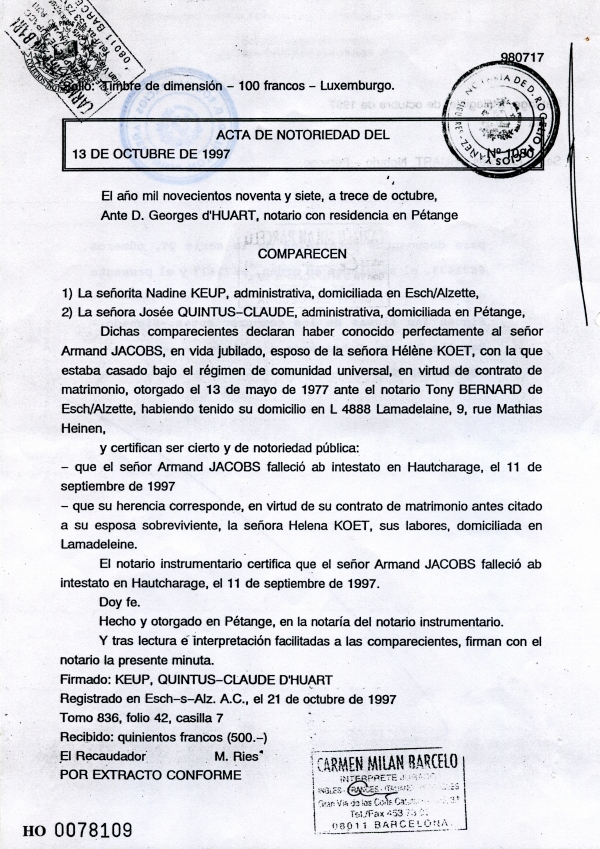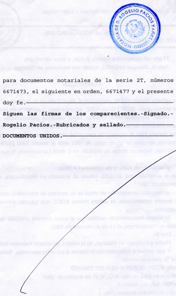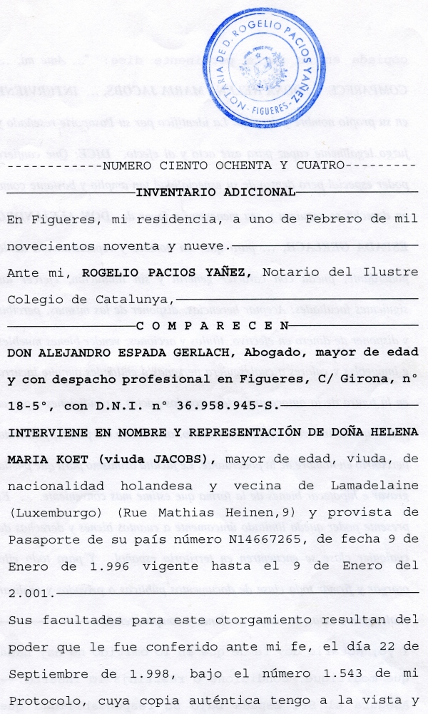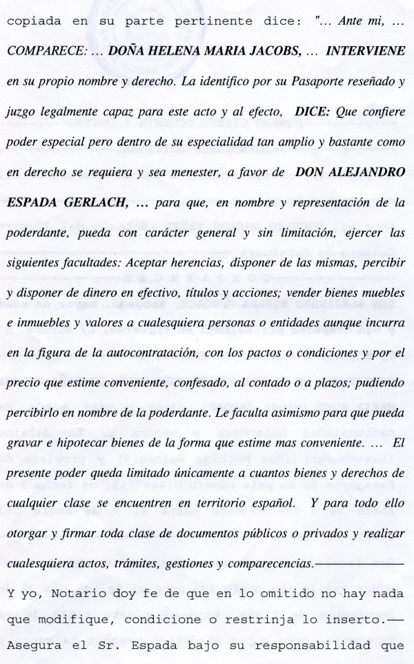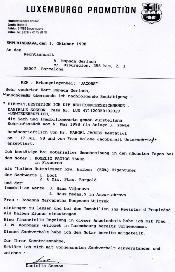Breve Traduccion.... Luxemburgo Promotion SL Ref.: Herencia “Jacobs” Estimado Sr. Espada Gerlach, Según su deseo le remito la siguiente confirmación: Con este escrito yo, Danielle Sosson, DNI: Lux 4711203F0102029 Como firmante de este documento, confirmo irrevocablemente: Los valores materiales e inmuebles de listado del 6 de mayo 1998 (anexo) confirmado con firma por el Sr. Marcel Jacobs y aceptado con firma por su mujer Sra. Helene Jacobs. Confirmo de efectuar en los próximos días el cambio de titular por escritura notarial en La Notaria Rogelio Pacios Yanez de Figueras. La mitad del uso fructo y de la propiedad (50 %) 1/ Barco 2/ 8 Millones de Ptas.,- 3/ Casa Villanueva 4 Casa Medas 9 de Empuriabrava A nombre de Johanna Margaretha Koopmans-Wilczek, y de ocupar me de la entrega en el registro de la propiedad de dicho cambio de titularidad. Un arreglo financiero a tal efecto ya se ha efectuado con la Sra. J.M. Koopmans- Wilczek en Luxemburgo. He informado el Notario de estos hechos. Para su conocimiento me declaro conforme estos hechos y firmo: Danielle Sosson. __________________________________________________________________________________________ PRUEBA, PODER DE LA SRA. JACOPS AL ABOGADO SR. GERLACH
