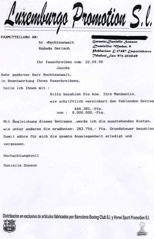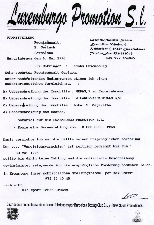 Breve Traduccion.... Luxemburgo promotion SL Fax Empuriabrava al 6 de Mayo 1998 Dr. Entringer ./. Jacobs Luxembourg Estimado señor Gerlach, Bajo las condiciones aquí mencionadas estoy de acuerdo con un arreglo fuera de los tribunales. A/ Cambio de titular del inmueble: Medas 9, Empuriabrava B/ Cambio de titular del Inmueble: Vilanueva/ Castelló s/n c/ Cambio de titular del inmueble: Local S. Margarita D/ Cambio de titular del barco A la empresa Luxemburgo Promotion SL y pasado por notaría Así como un pago en liquido de 8.000.000,- Ptas. Con lo cual renuncio a la mitad de nuestra demanda inicial. Esta oferta de arreglo extrajudicial seguirá vigente hasta el día 30 de Mayo del 1998 Si a caso no se hayan efectuado los pago, ni los cambios de titulares por notaría, seguirá vigente nuestra demanda inicial. Esperando su comentario al efecto por fax quedamos, Un saludo deportivo, __________________________________________________________________________________________