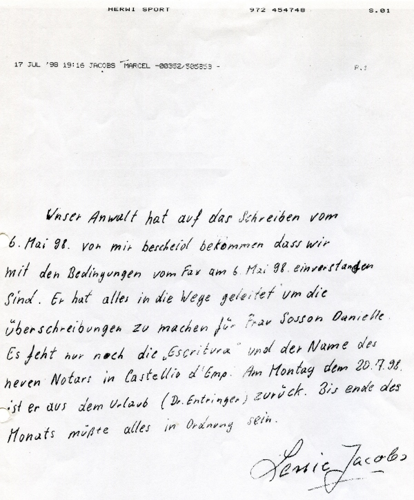 Breve Traduccion.... Hemos instruido nuestro abogado de que estamos de acuerdo con sus condiciones Mencionadas en su fax del 6 de Mayo 1998, Ha puesto todo en marcha para que las cambios de titulare pueden se r efectuados por la Sra. Sasson Danielle. Solo falta la escritura, y el nombre del nuevo notario de Castelló d' Empuries. El Dr. Entringer volverá de vacaciones el día Lunes 20-07-1998, hasta finales del mes todo debería estar en regla. Firmado: LJ __________________________________________________________________________________________