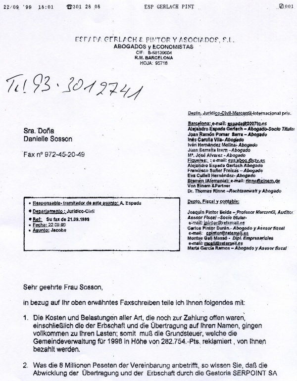 Breve Traduccion.... Estimada Sra. Sosson, Referente a su fax aquí arriba mencionado le comunico lo siguiente, 1/ Los gastos y impuestos de todo tipo, impagados, incluyendo los de la herencia, y el cambio de titular a su nombre van enteramente a su cargo, así que los impuestos catastrales del ayuntamiento para el año 1998 sumando 282.754,- Ptas. deben de ser pagados por Usted. 2/ Referente a los 8.000.000,- Ptas. del convenio, usted sabe que los tramites de cambios de titular y la herencia, gestionados por la Gestoría Serpoint SA…. __________________________________________________________________________________________